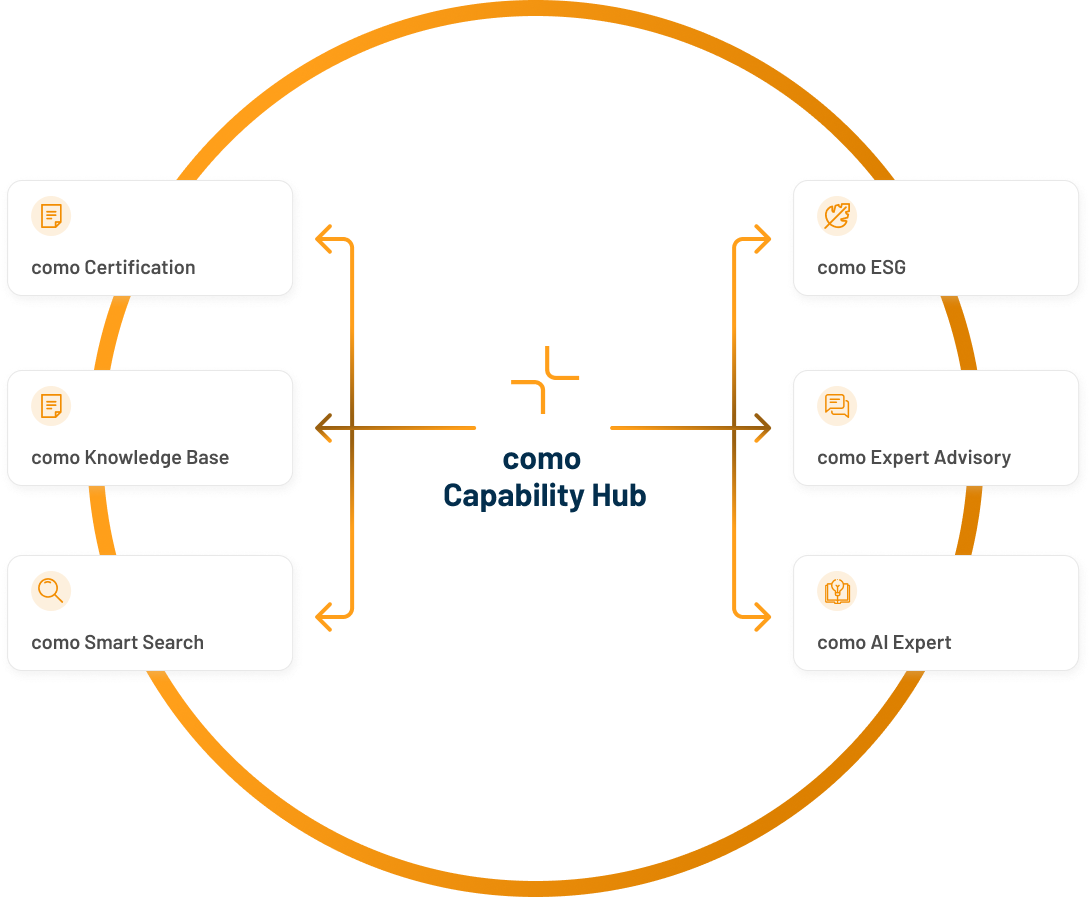 Connectors, APIs, and orchestrated workflows deliver reliable data to Certification, Knowledge, Smart Search, Virtual Colleague, and more—with monitoring and clear process logic. Part of the como Capability Hub.